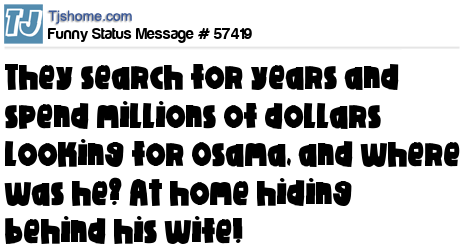 X says they search for years and spend millions of dollars looking for Osama, and where was he? At home hiding behind his wife!