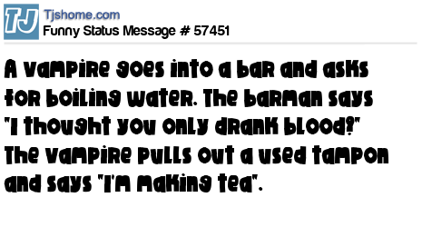 - # 15854 A vampire goes into a pub and asks 4 boiling water. The barman says "I thought you only drank blood?" The vampire pulls out a used tampon and says "Im making tea"