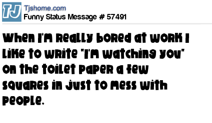 X says When I'm really bored at work I like to write "I'm watching you" on the toilet paper a few squares in just to mess with people.