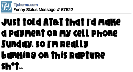 X  Just told AT&T that I'd make a payment on my cell phone Sunday, so I'm really banking on this rapture sh*t..