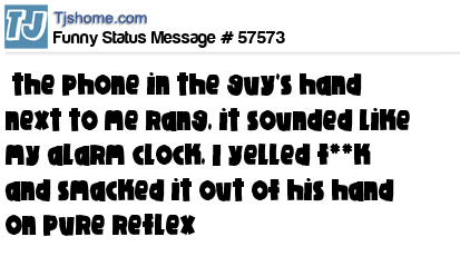 X   the phone in the guy's hand next to me rang, it sounded like my alarm clock, I yelled f**k and smacked it out of his hand on pure reflex
