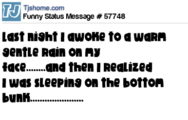 X says Last night I awoke to a warm gentle rain on my face........and then I realized I was sleeping on the bottom bunk......................
