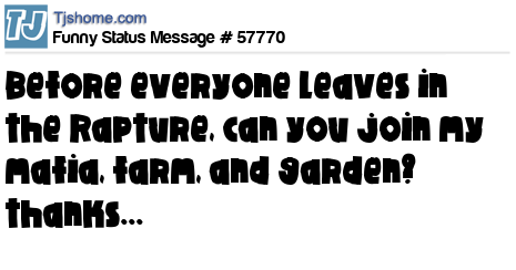 X before everyone leaves in the Rapture, can you join my mafia, farm, and garden? thanks...