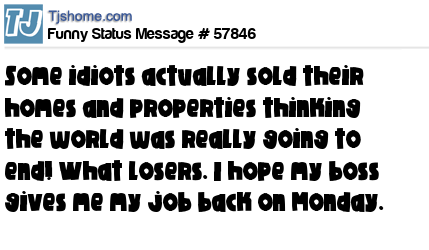 X Some idiots actually sold their homes and properties thinking the world was really going to end! What losers. I hope my boss gives me my job back on Monday.