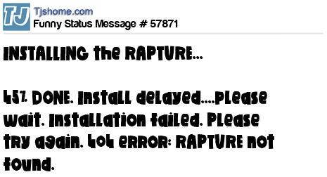 X is INSTALLING the RAPTURE... ███████████████░░░░░░░░░░░░░░░░░ 45% DONE. Install delayed....please wait. Installation failed. Please try again. 404 error: RAPTURE not found.
