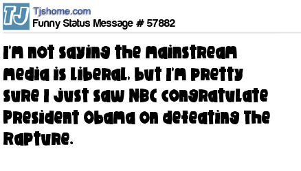 X I'm not saying the mainstream media is liberal, but I'm pretty sure I just saw NBC congratulate President Obama on defeating The Rapture.