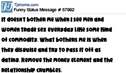X is It doesn't bother me when I see men and women trade sex everyday like some kind of commodity. What bothers me is when they disguise and try to pass it off as dating. Remove the money element and the relationship crumbles.