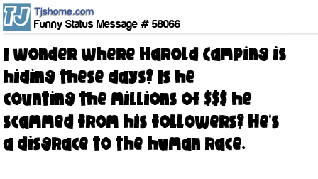 X is I wonder where Harold Camping is hiding these days? Is he counting the millions of $$$ he scammed from his followers? He's a disgrace to the human race.