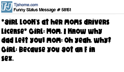 X *girl look's at her moms drivers license* Girl: Mom, I know why dad left you! mom: Oh yeah, why? Girl: Because you got an F in sex.