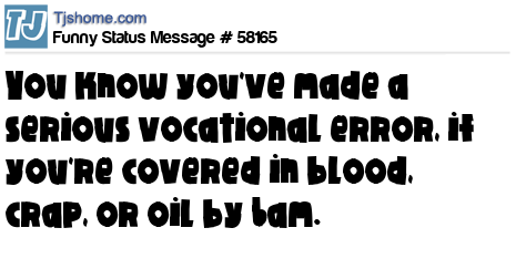 X You know you've made a serious vocational error, if you're covered in blood, crap, or oil by 6am.