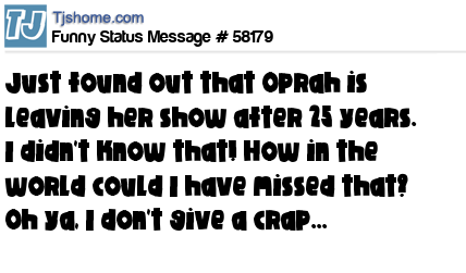 X is Just found out that Oprah is leaving her show after 25 years. I didn't know that! How in the world could I have missed that? Oh ya, I don't give a crap...