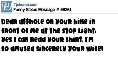 X says Dear a$$hole on your bike in front of me at the stop light; yes I can read your shirt, I'm so amused sincerely your wife!