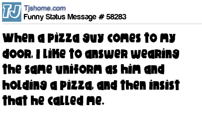 - # 161398 When a pizza guy comes to my door I like to answer wearing the same uniform as him with an empty pizza box then insist that he called me