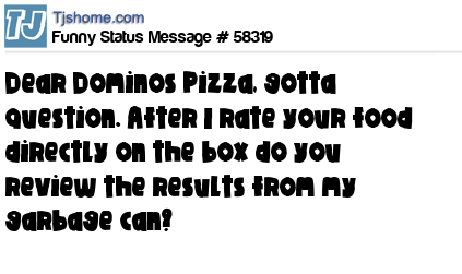 X Dear Dominos Pizza, gotta question. After I rate your food directly on the box do you review the results from my garbage can?