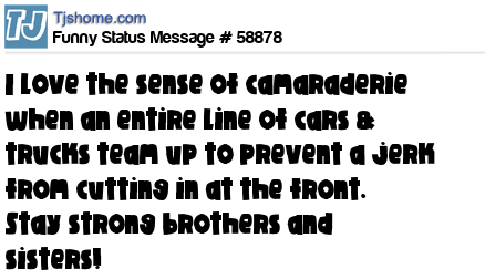 X I love the sense of camaraderie when an entire line of cars & trucks team up to prevent a jerk from cutting in at the front. Stay strong brothers and sisters!