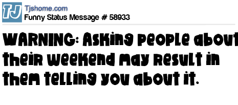 X is WARNING: Asking people about their weekend may result in them telling you about it.