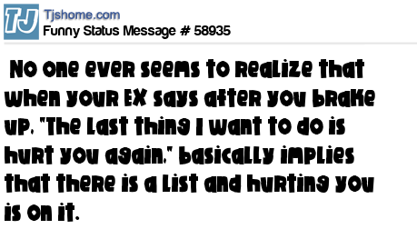 X is No one ever seems to realize that when your EX says after you brake up, "The last thing I want to do is hurt you again," basically implies that there is a list and hurting you is on it.