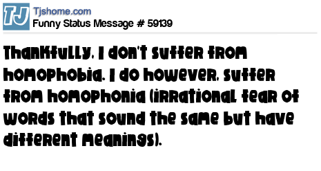 X Thankfully, I don't suffer from homophobia. I do however, suffer from homophonia (irrational fear of words that sound the same but have different meanings).