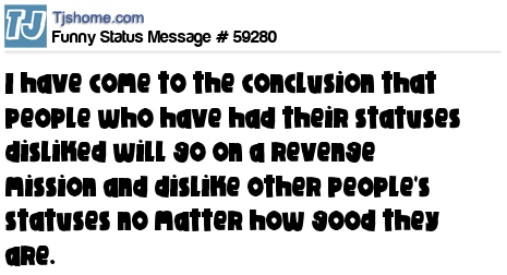 X is I have come to the conclusion that people who have had their statuses disliked will go on a revenge mission and dislike other people's statuses no matter how good they are.