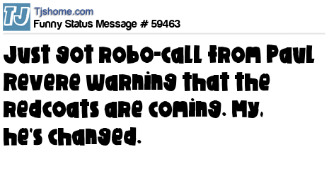 X Just got robo-call from Paul Revere warning that the redcoats are coming. My, he's changed.