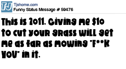 X This is 2011. Giving me $10 to cut your grass will get me as far as mowing "F**K YOU" in it.