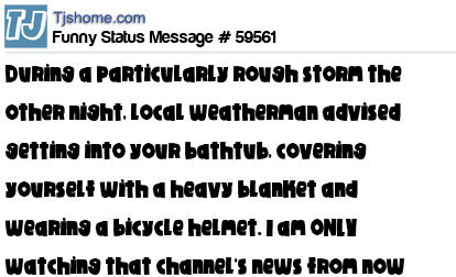 X is During a particularly rough storm the other night, local weatherman advised getting into your bathtub, covering yourself with a heavy blanket and wearing a bicycle helmet. I am ONLY watching that channel's news from now on..."