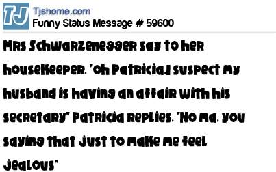 X is Mrs Schwarzenegger say to her housekeeper, "oh Patricia,I suspect my husband is having an affair with his secretary" Patricia replies, "No ma, you saying that just to make me feel jealous"