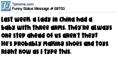 X is Last week, a lady in China had a baby with three arms. They're always one step ahead of us aren't they? He's probably making shoes and toys right now as I type this.