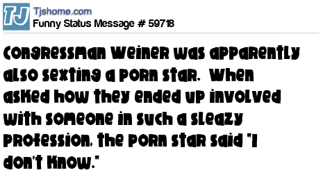 X Congressman Weiner was apparently also sexting a porn star. When asked how they ended up involved with someone in such a sleazy profession, the porn star said "I don't know."