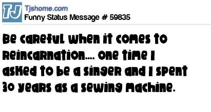 X Be careful when it comes to reincarnation…. one time I asked to be a singer and I spent 30 years as a sewing machine.