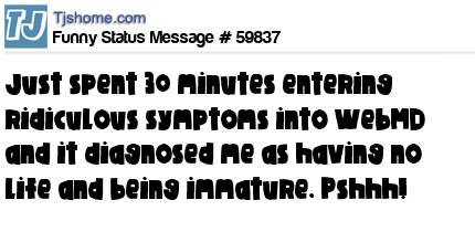 X just spent 30 minutes entering ridiculous symptoms into WebMD and it diagnosed me as having no life and being immature. Pshhh!