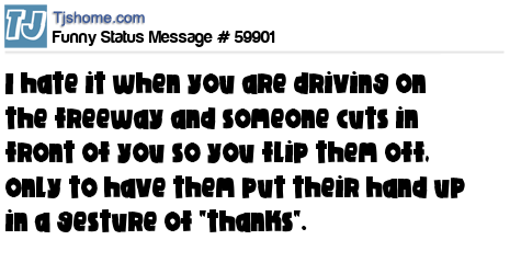 X I hate it when you are driving on the freeway and someone cuts in front of you so you flip them off, only to have them put their hand up in a gesture of "thanks".