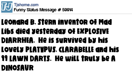 X says Leonard B. Stern inventor of Mad Libs died yesterday of EXPLOSIVE DIARRHEA. He is survived by his lovely PLATYPUS, CLARABELLE and his 99 LAWN DARTS. He will truly be A DINOSAUR