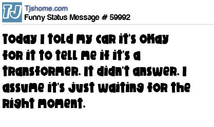 - # 40092 Today I told my car it's okay for it to tell me if it's a transformer. It didn't answer. I figure it's just waiting for the right moment.