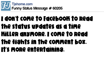 X I don't come to Facebook to read the status updates as a time killer anymore, I come to read the fights in the comment box. It's more entertaining.