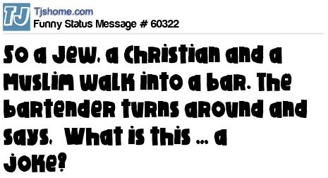 X is So a Jew, a Christian and a Muslim walk into a bar. The bartender turns around and says, “What is this … a joke?”