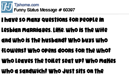 X is I have so many questions for people in lesbian marriages. Like, who is the wife and who is the husband? Who buys who flowers? Who opens doors for the who? Who leaves the toilet seat up? Who makes who a sandwich? Who just sits on the sofa watching sport?