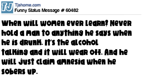 X is When will women ever learn? Never hold a man to anything he says when he is drunk. It's the alcohol talking and it will wear off. And he will just claim amnesia when he sobers up.
