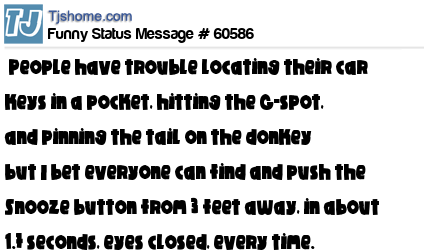 - # 22396 Even under ideal conditions people have trouble locating their car keys in a pocket, finding their cell phone but I'd bet my a$$ everyone can find and push the Snooze button from 3 feet away, in about 1.7 seconds, eyes closed, first time every time...