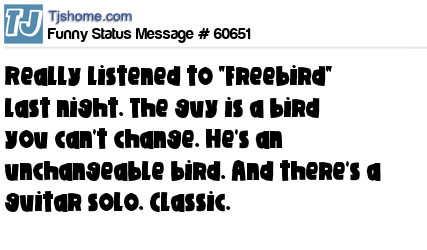 X Really listened to "Freebird" last night. The guy is a bird you can't change. He's an unchangeable bird. And there's a guitar solo. Classic.