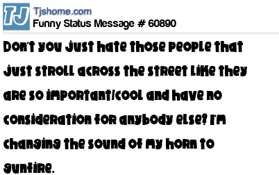 X Don't you just hate those people that just stroll across the street like they are so important/cool and have no consideration for anybody else? I'm changing the sound of my horn to gunfire.