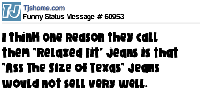 X I think one reason they call them "Relaxed Fit" jeans is that "Ass The Size of Texas" jeans would not sell very well.