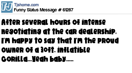 X After several hours of intense negotiating at the car dealership, I'm happy to say that I'm the proud owner of a 30ft. inflatible Gorilla...Yeah baby.....