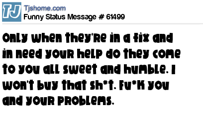 X says Only when they're in a fix and in need your help do they come to you all sweet and humble. I won't buy that sh*t. Fu*k you and your problems.