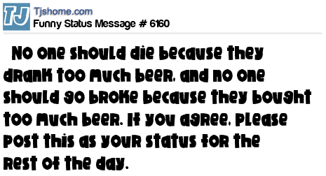 X says No one should die because they drank too much beer, and no one should go broke because they bought too much beer. If you agree, please post this as your status for the rest of the day.