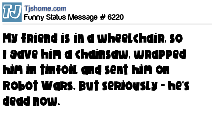 X My friend is in a wheelchair, so I gave him a chainsaw, wrapped him in tinfoil and sent him on Robot Wars. But seriously - he's dead now.