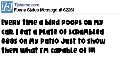 - # 60174 Every time a bird poops on my car... I eat a plate of scrambled eggs on my patio just to show them what I'm capable of