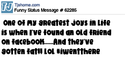 X is One of my greatest joys in life is when I've found an old friend on facebook......And they've gotten fat!! lol #iwentthere