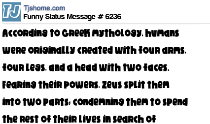 - # 14165 According to greek mythology, humans were originally created with 4 arms, 4 legs and a head with two faces. Fearing their power, zeus split them into two separate parts, condemning them to spend their lives in search of their other halves.