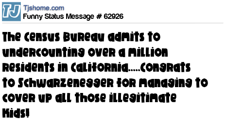 X The Census Bureau admits to undercounting over a million residents in California.....Congrats to Schwarzenegger for managing to cover up all those illegitimate kids!